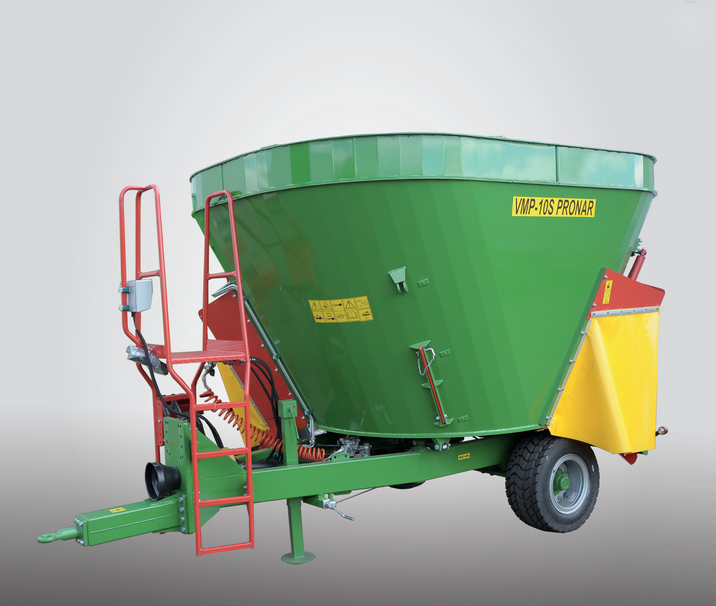Змішувач-роздавач кормів PRONAR VMP-10S з об'ємом 10 м3 - є ідеальне рішенням для ферми на 50-60 голів великої рогатої худоби. Впроваджений механізм перемішування компонентів корму не вимагає великої потужності трактора. Модель PRONAR VMP-10S призначений для приготування корму з усіх видів інгредієнтів (тверді, порошкоподібні, гранульовані, вітамінні або мінеральні препарати та продукти харчування), що підвищують ефективність виробництва молока. Два несиметрично розташованих вивантажувальних вікна забезпечують рівномірне і плавне вивільнення кузова. Дев'ять ріжучих ножів на шнеку гарантують довгу і безаварійну роботу кормороздавача.