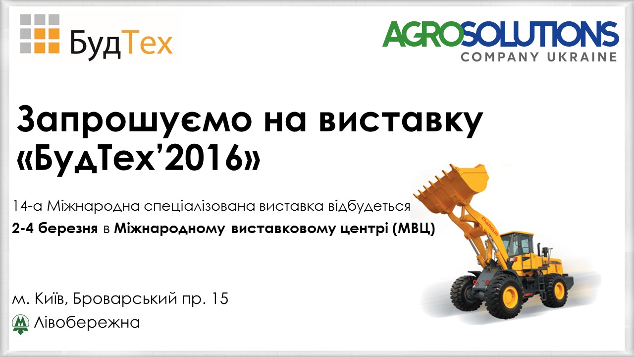 Запрошуємо вас відвідати наш стенд на 14-й Міжнародній спеціалізованій виставці «БудТех’2016», яка буде проходити з 2 по 4 березня в Міжнародному виставковому центрі (МВЦ), за адресою: м. Київ, Броварський проспект 15 (ст. метро Лівобережна). У вас буде можливість ознайомитися та побачити на власні очі спецтехніку від світового виробника компанії Changlin. Також ви зможете отримати професійні консультації з приводу вибору техніки, підбору запасних частин та технічного обслуговування.