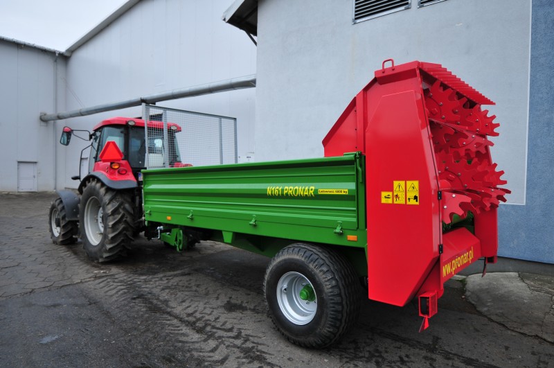 Одноосний розкидач PRONARN161 вантажопідйомністю 6 тон, є найменшою машиною в модельному ряду компанії. Ця машина є відмінним вибором для невеликих господарств. Горизонтальний разкидальний адаптер з двома валами дозволяє вносити всі види гною, вапно, торф і компост. На цих валах встановлені взаємозамінні лопаті питу «роги лося», які забезпечують ретельне подрібнення та розподілення добрив по полю. Кузов розкидача розроблений таким чином, що можна легко та швидко відкривати його бічні стіни. Подаючий ланцюговий транспортер з гідроприводом розміщений кузові.