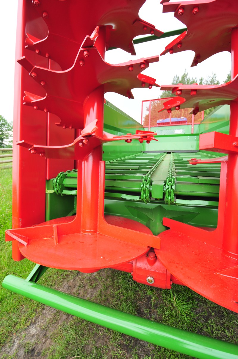 - Конвеєр з чотирма ланцюгами товщиною 14 мм з високоякісної сталі з гідравлічним приводом і плавним регулюванням швидкості ходу