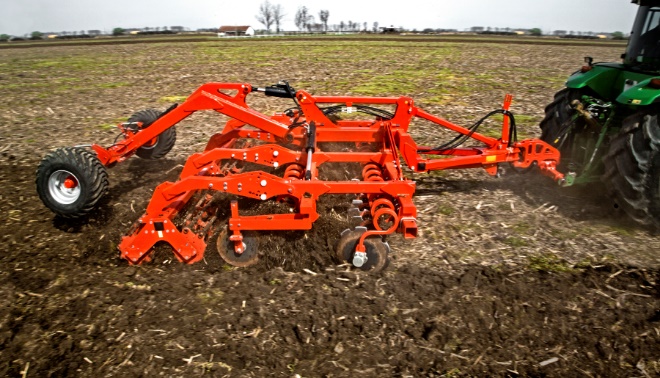 - Двойная пружина: каждый диск установлен на индивидуальной вдвойне изогнутой пружинной стойке, которая передает дисковому элементу 3-мерное движение, при работе машины на большой скорости переходит в вибрацию и очень эффективно используется в процессе обработки почвы.