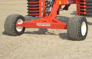 Данная машина оснащена задней тележкой с транспортными колесами размером 400/60-15.5, которые переводятся в рабочее положение с помощью гидравлики.