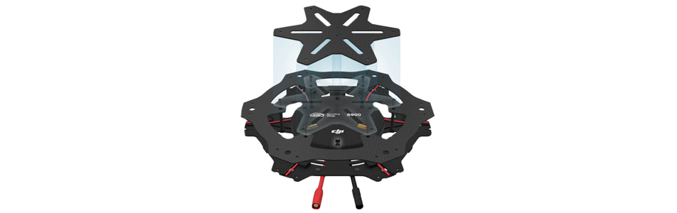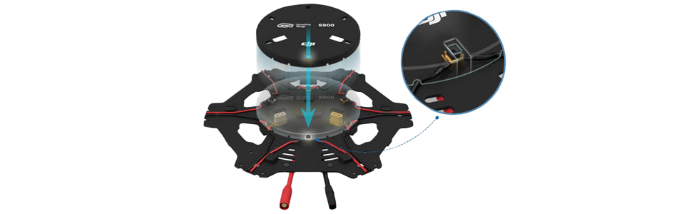 Знімна верхня центральна пластина. Верхня центральна пластина S900 є знімним елементом, тим самим дозволяє встановити ІРУ, iOSD, Ligtbridge, польотний контролер, систему розподілу електроживлення та інші модулі.